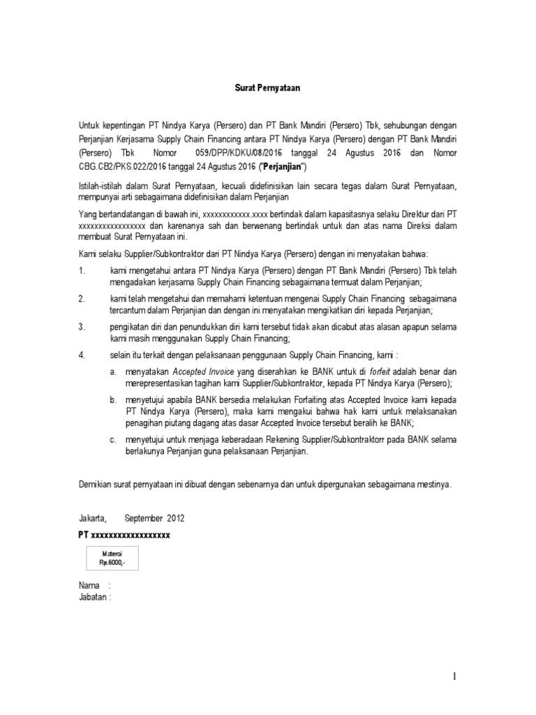 Surat Pernyataan Dan Permohonan Pencairan Scf Bank Mandiri