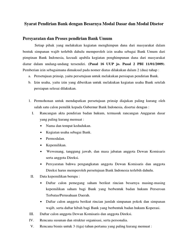 Izin pendirian bank umum dan bank perkreditan rakyat meliputi izin prinsip dan izin usaha, sesuai yang tercantum dalam uu no. Pada proses izin usaha dari bank indonesia diperlukan 2 tahap yaitu tahap persetujuan prinsip dan perolehan izin usaha. Syarat pendirian bank syariah demi terbangunnya fondasi yang kokoh bagi pertumbuhan perbankan syariah, bank indonesia (bi) menerbitkan peraturan bank indonesia (pbi) nomor 11/3/pbi/2009 atas perubahan pbi no 7/15/pbi/2005 tentang jumlah modal inti minimum bank.